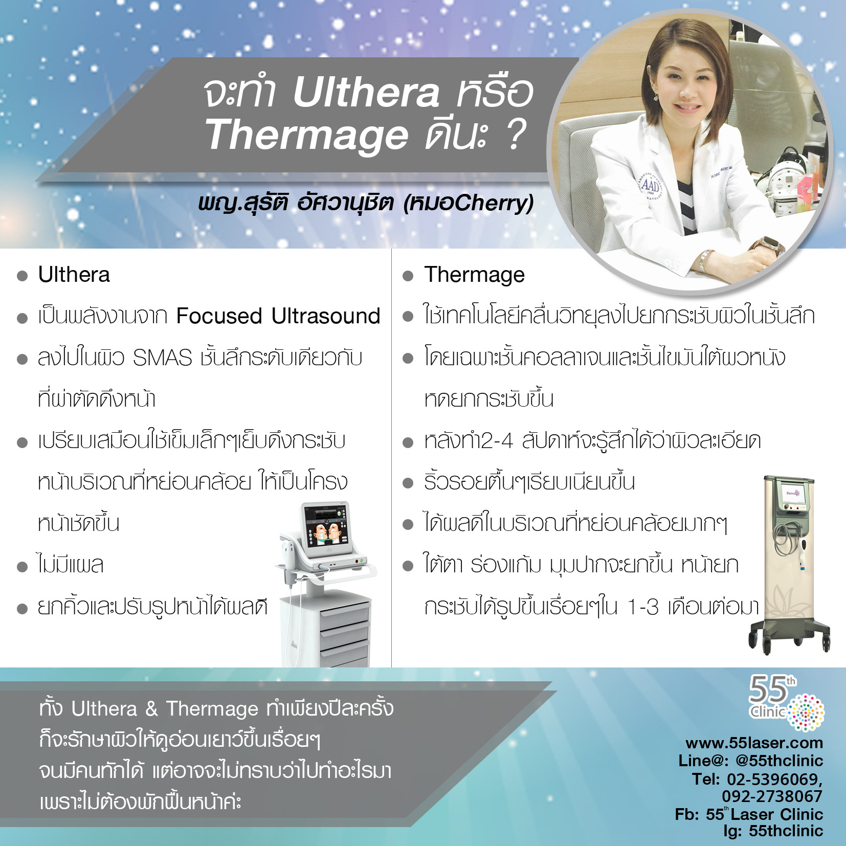 จะทำ Ulthera หรือ Thermage ดีนะ ? มาอ่านรายละเอียดจากบทความของคุณหมอกันค่ะ ;) Ulthera ( อัลเธอร่า ) เป็นพลังงานจาก Focused Ultrasound ลงไปในผิว SMAS ชั้นลึกระดับเดียวกับที่ผ่าตัดดึงหน้า เปรียบเสมือนใช้เข็มเล็กๆเย็บดึงกระชับหน้าบริเวณที่หย่อนคล้อย ให้เป็นโครงหน้าชัดขึ้น ไม่มีแผล ยกคิ้วและปรับรูปหน้าได้ผลดี Thermage ( เทอมาจ ) ใช้เทคโนโลยีคลื่นวิทยุลงไปยกกระชับผิวในชั้นลึก โดยเฉพาะชั้นคอลลาเจนและชั้นไขมันใต้ผิวหนัง หดยกกระชับขึ้น หลังทำ2-4 สัปดาห์จะรู้สึกได้ว่าผิวละเอียด ริ้วรอยตื้นๆเรียบเนียนขึ้น ได้ผลดีในบริเวณที่หย่อนคล้อย ใต้ตา ร่องแก้ม มุมปากจะยกขึ้น หน้ายกกระชับได้รูปขึ้นเรื่อยๆใน 1-3 เดือนต่อมา : ทั้ง Ulthera & Thermage ทำต่อเนื่องปีละครั้ง ก็จะรักษาผิวให้ดูอ่อนเยาว์ขึ้นเรื่อยๆ จนมีคนทักได้ แต่อาจจะไม่ทราบว่าไปทำอะไรมา เพราะไม่ต้องพักฟื้นหน้าค่ะ