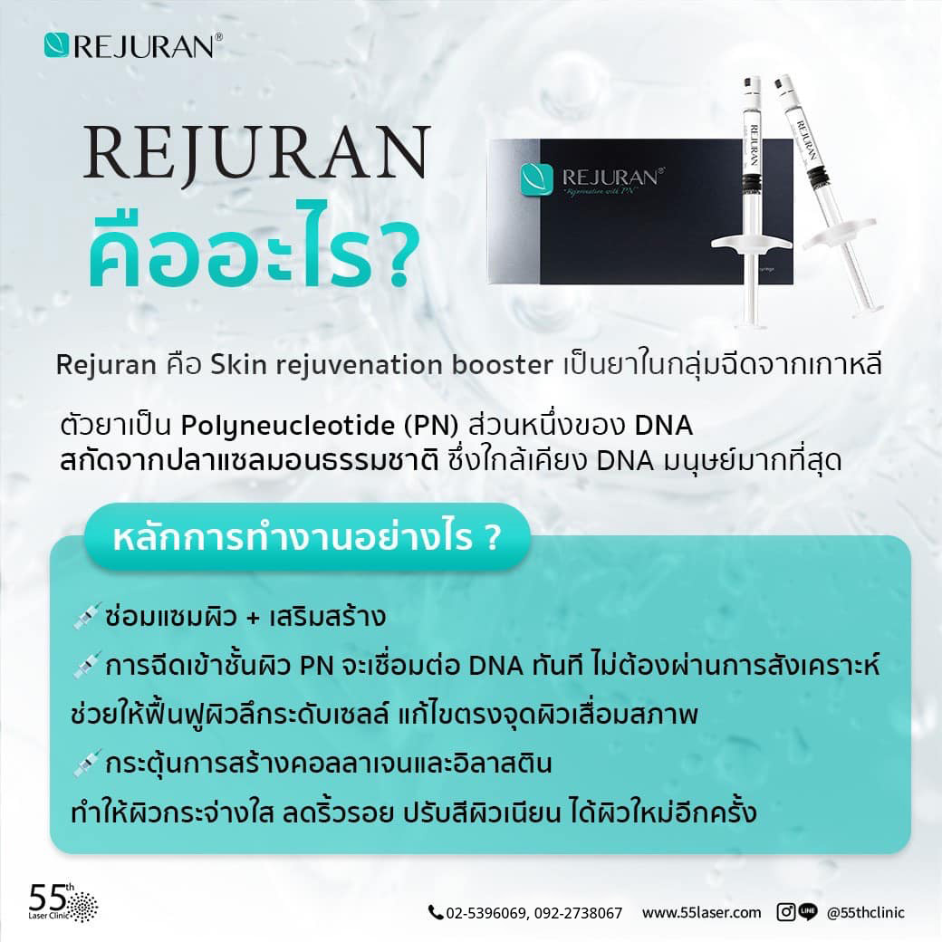 Rejuran คืออะไร?Rejuran คือ Skin rejuvenation booster เป็นยาในกลุ่มฉีด จากเกาหลี ตัวยาเป็น Polyneucleotide (PN) ส่วนหนึ่งของ DNA สกัดจากปลาแซลมอนธรรมชาติ ซึ่งใกล้เคียง DNA มนุษย์มากที่สุด