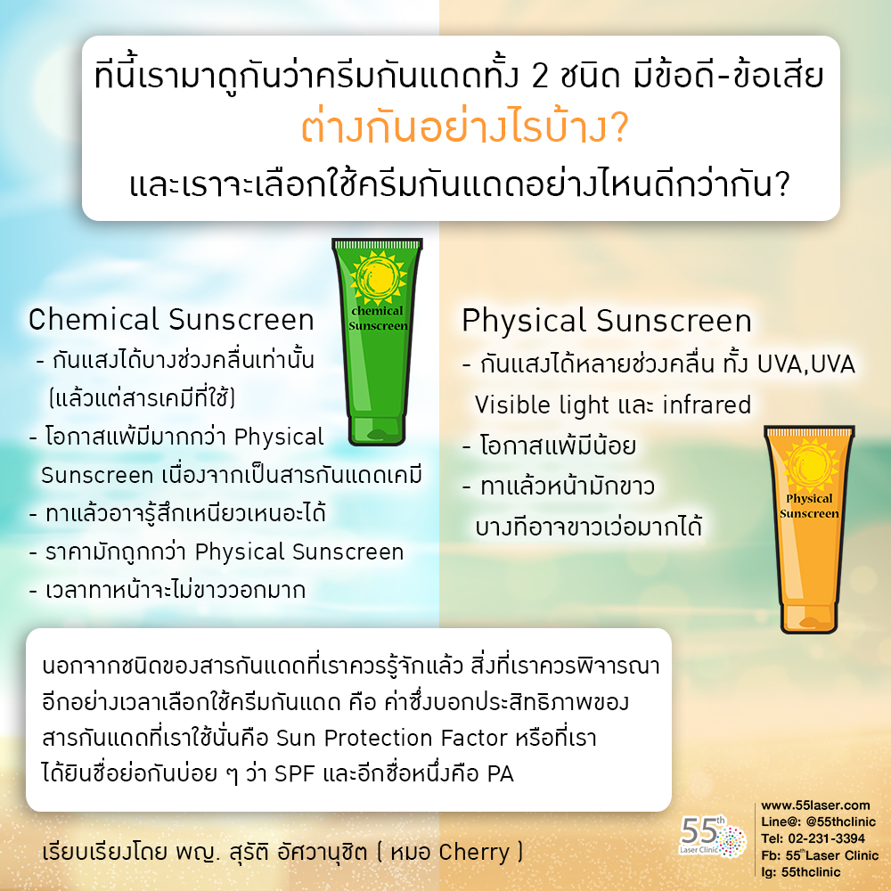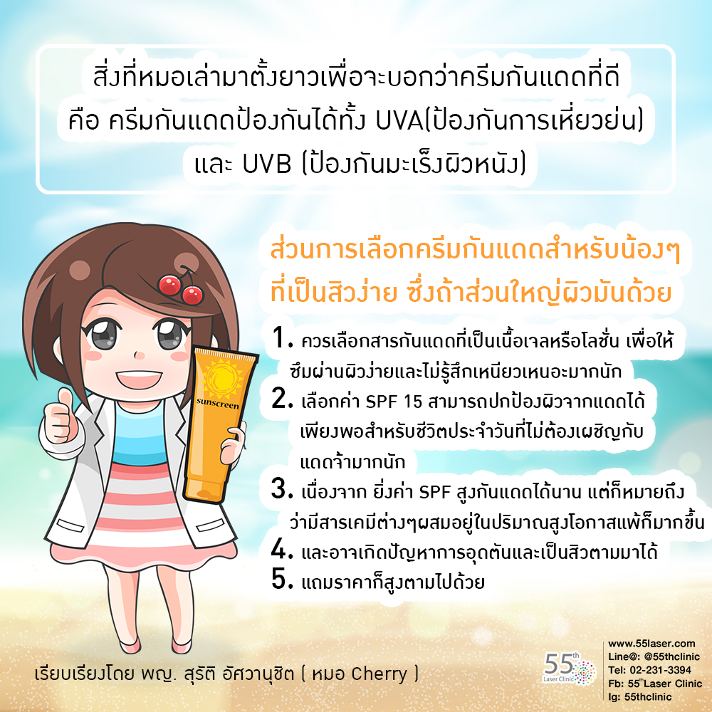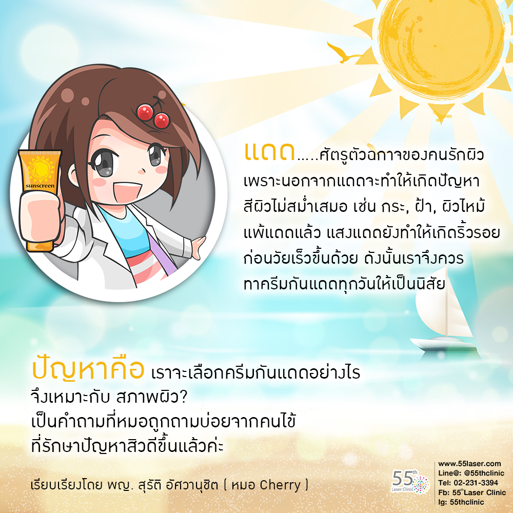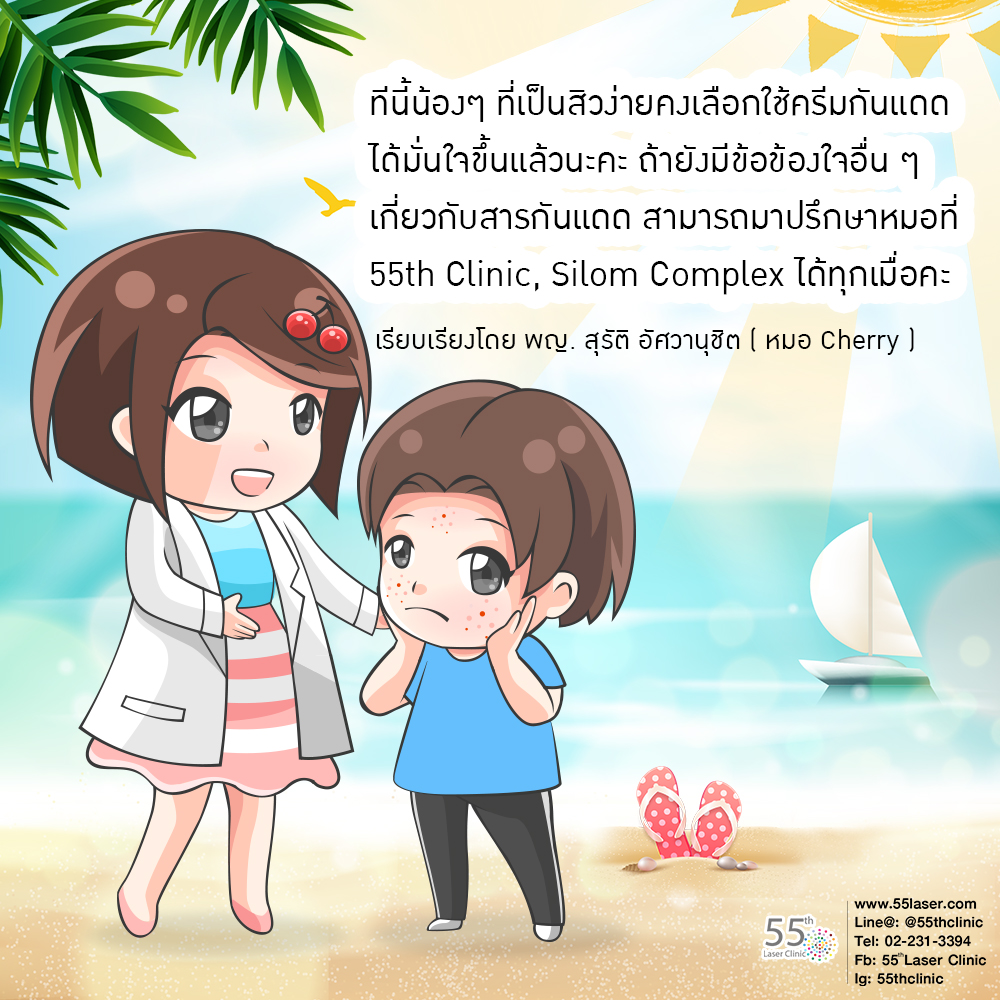 ทีนี้น้องๆ ที่เป็นสิวง่ายคงเลือกใช้ครีมกันแดดได้มั่นใจขึ้นแล้วนะคะ ถ้ายังมีข้อข้องใจอื่น ๆ เกี่ยวกับสารกันแดด สามารถมาปรึกษาหมอที่ 55th Clinic, Silom Complex ได้ทุกเมื่อคะ